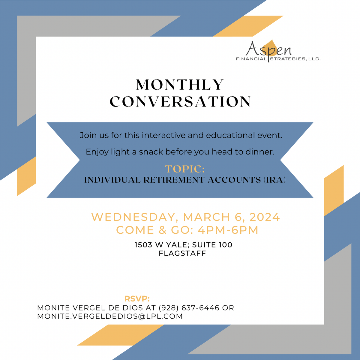 This is a come and go event. Stop in on your way home from work or on your way to dinner. Enjoy an interactive conversation about IRAs, drinks, and light appetizers.