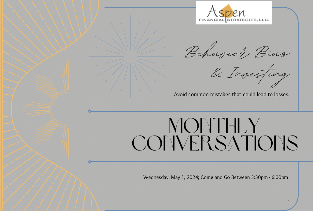 Join us for drinks and appetizers on Wednesday, May 1 between 3:30-6:00pm. Come and go as you please, learn the relationship between behavior bias and investing and how you can avoid the common mistakes. This is a great time to ask questions. You are welcome no matter how much or little you know.